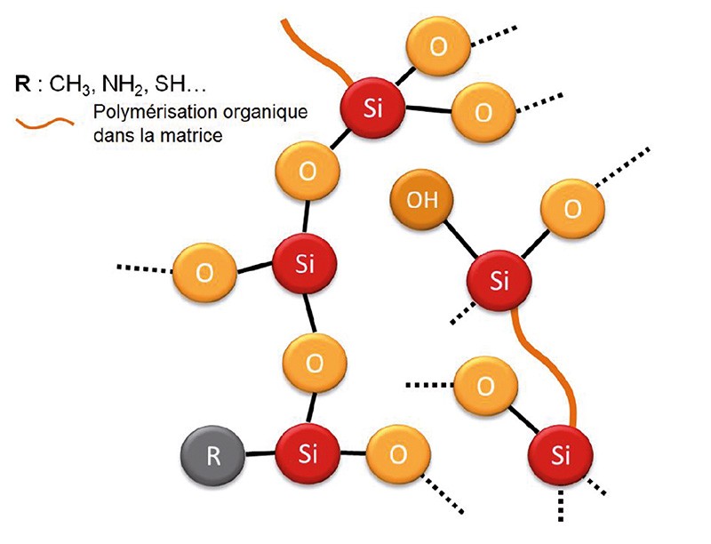 Le réseau inorganique Si-O-Si est produit par un procédé sol-gel permettant de fabriquer un polymère inorganique par des réactions chimiques simples et à une température proche de la température ambiante.