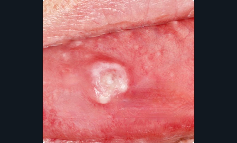 - Sur la lèvre inférieure droite, on observait une tumeur hémisphérique, bien limitée, de 8 mm de diamètre, indolore. Le centre de la lésion était occupé par une large ulcération superficielle, plane, recouverte d’un enduit fibrino-leucocytaire ; les bords, surélevés et légèrement kératosiques, formaient un bourrelet périphérique, presque continu. Ce bourrelet, dans sa partie supérieure, présentait une expansion vers le haut, de 5 mm sur 3 mm de large, et cette expansion était recouverte de kératose. La lésion reposait sur une base indurée, peu marquée mais nettement présente. Le reste de la muqueuse buccale avait un aspect normal. La palpation n’a pas retrouvé d’adénopathie cervico-faciale. Selon la patiente, le praticien qui avait pratiqué l’exérèse de la lésion ne lui semblait pas, a posteriori, maîtriser parfaitement la chirurgie buccale, ce qui expliquerait l’aspect particulier de la lésion.