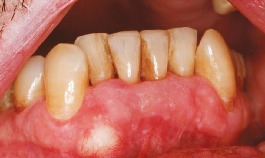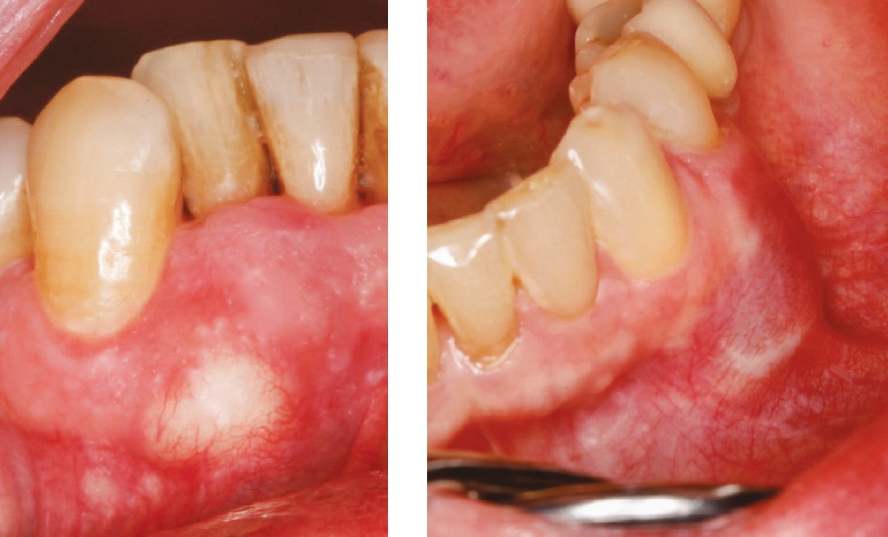 Motif de la consultation. Patient de 72 ans venu consulter sur les conseils de son hygiéniste dentaire [la prise en charge se déroule en Suisse, Ndlr] qui a remarqué la présence d’une tuméfaction gingivale vestibulaire.