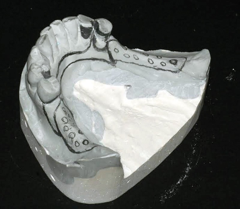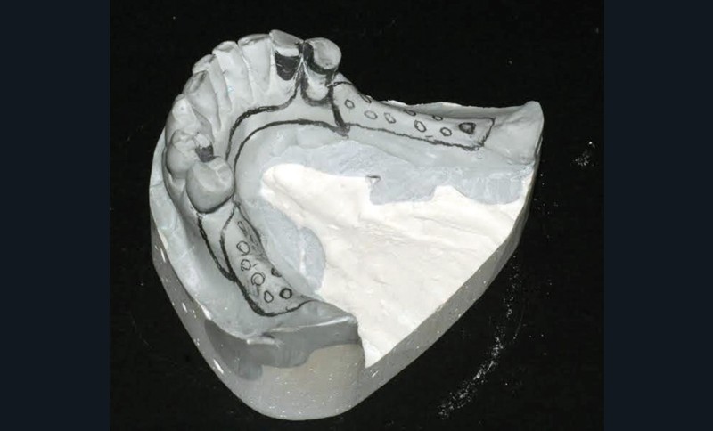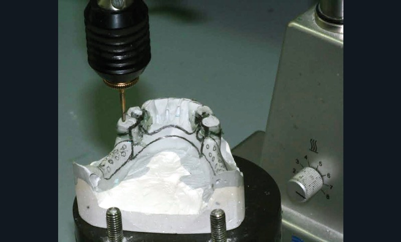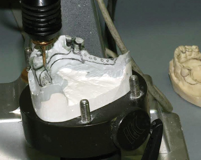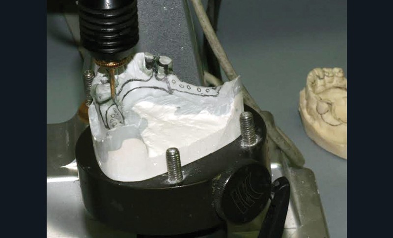 Le prothésiste cherche le meilleur axe d’insertion du futur appareil. D’abord en plaçant le modèle sur une surface plane (plan d’occlusion) et en variant la position du plateau.