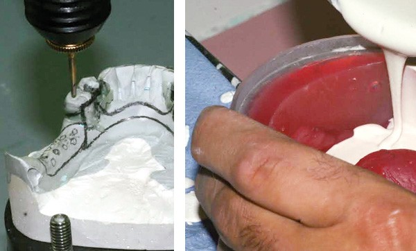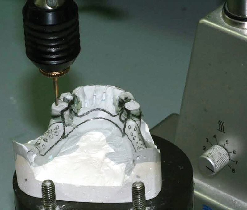 L’excès de cire est ensuite gratté avec un « couteau », toujours installé sur le paralléliseur, en gardant toujours le même axe d’insertion.