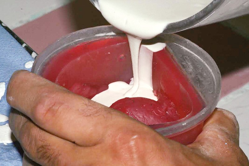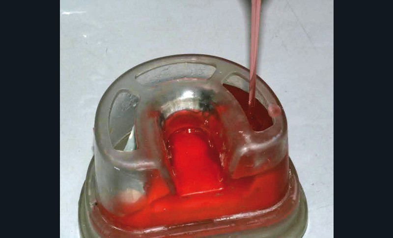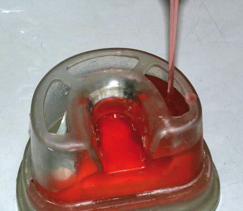 Une fois solidifié, le modèle dupliqué est démoulé et le maître modèle est conservé pour le retour au cabinet dentaire. Le silicone de duplication est nettoyé.