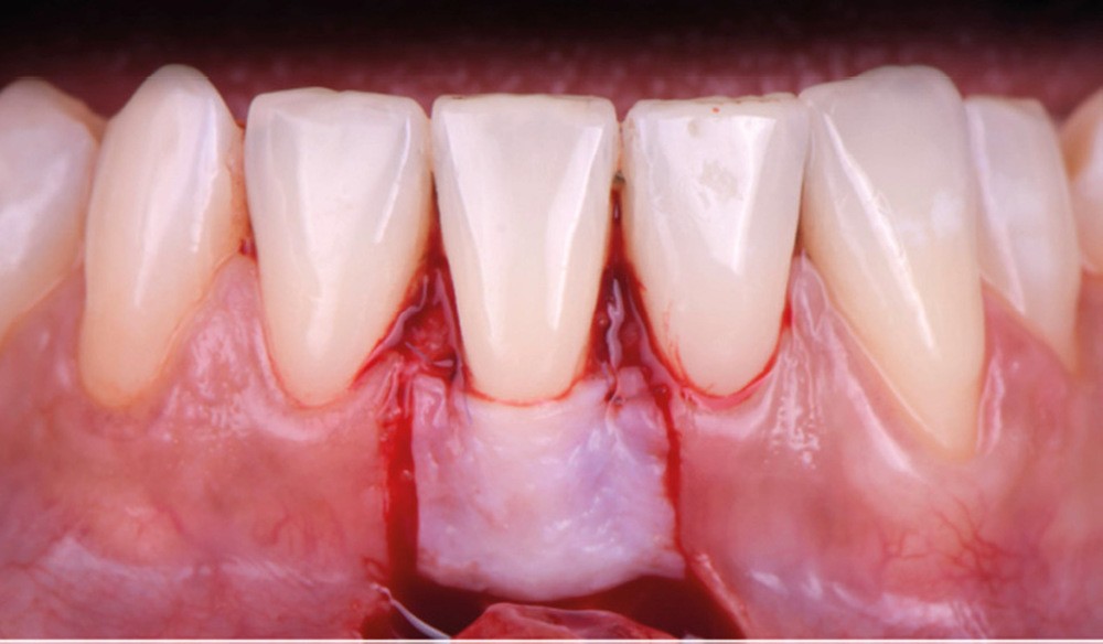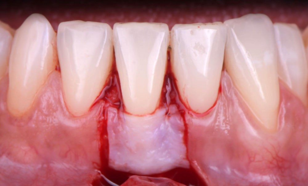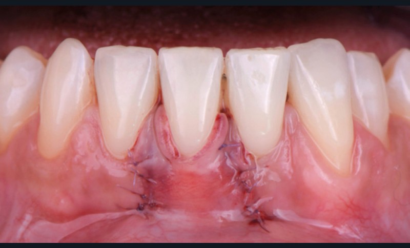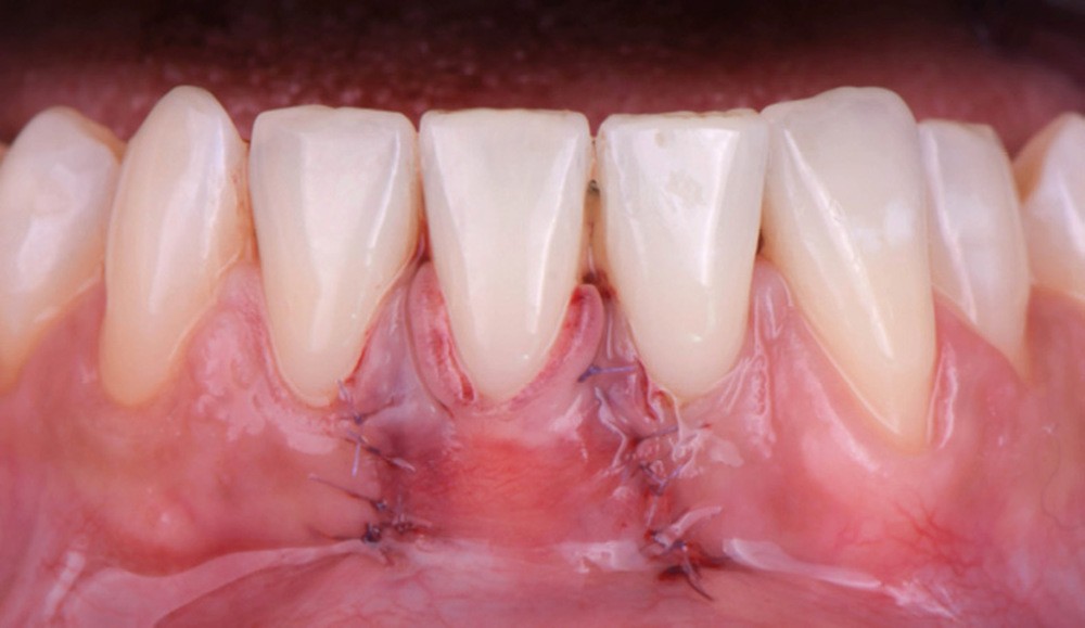 Selon le Dr Sylvie Pereira, lors de la réalisation de cette technique, le lambeau d’épaisseur partielle est suturé apicalement par trois points de sutures périostées matelassiers horizontaux. De plus, elle préconise de positionner le nœud du point de suture si le greffon est fin pour le maintenir au plus près du lit receveur.