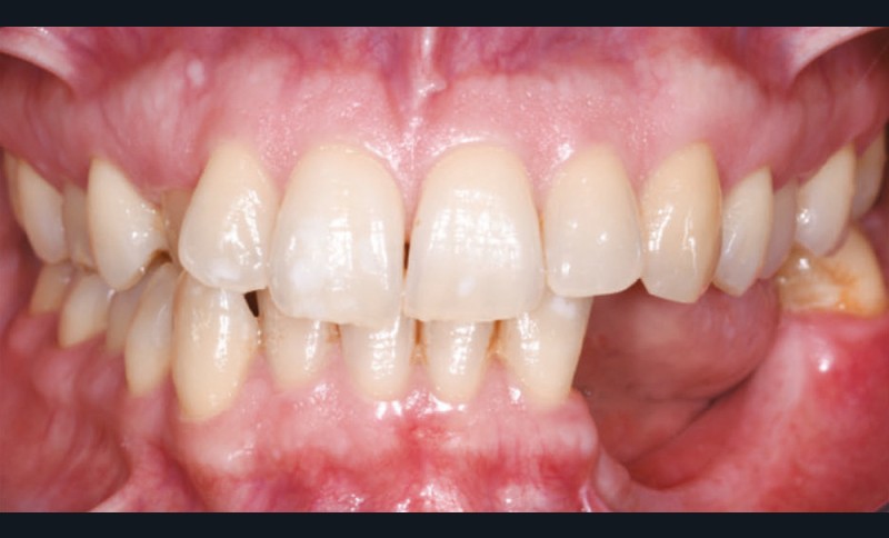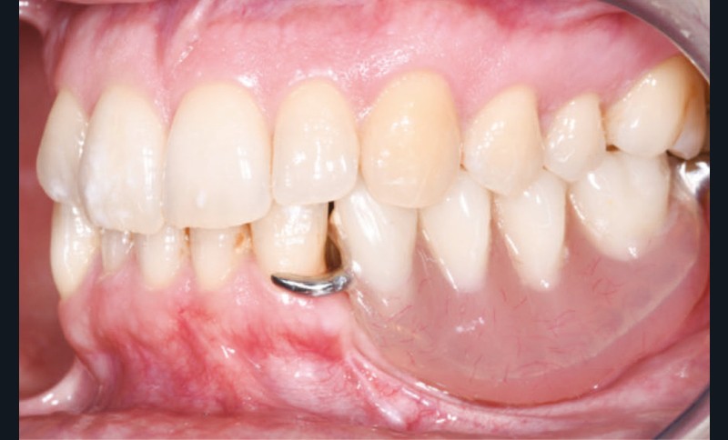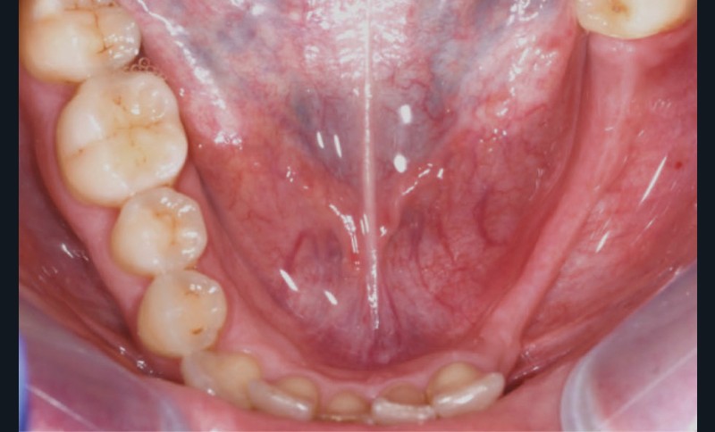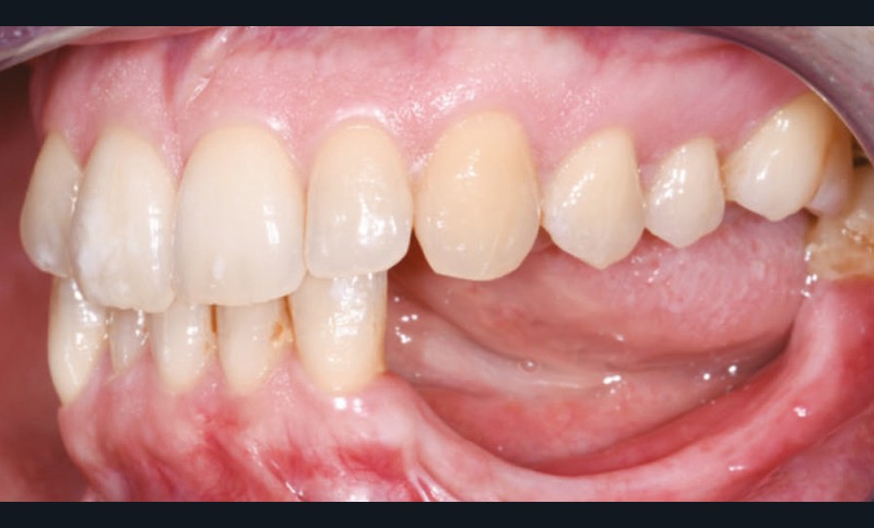 L’examen facial est sans particularités notables. L’examen buccal retrouve un édentement de 33 à 36, compensé par une prothèse amovible, avec une atrophie osseuse transversale et verticale majeure entraînant une augmentation de l’espace prothétique. Il persiste un fin bandeau de gencive kératinisée crestal. Le reste de la denture est sain, l’articulé est en classe I avec un inversé d’articulé sur 13 (fig. 1).