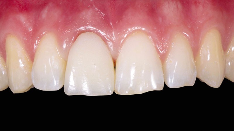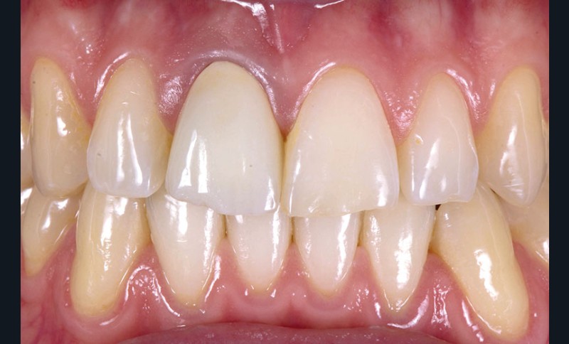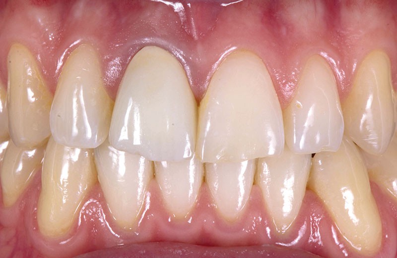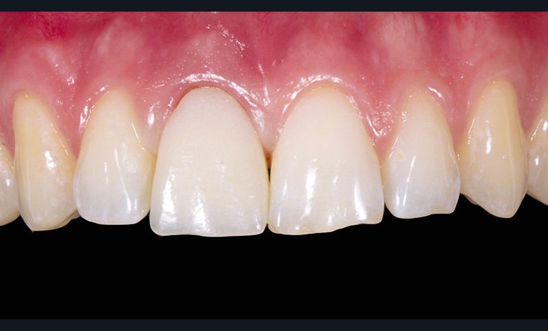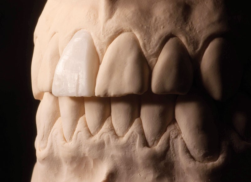 Un patient d’une trentaine d’années consulte afin de changer une ancienne couronne céramométallique sur la 11 (fig. 1). La couronne présente un problème d’adaptation et ne satisfait pas le patient sur le plan esthétique notamment l’aspect « grisâtre » au niveau du collet. Le traitement commence par la réalisation d’empreintes d’études et d’un wax-up de la dent à traiter (fig. 2). La couronne d’usage ainsi que la reconstruction coronoradiculaire coulée sous jacente sont déposées par découpe (fig. 3). Une couronne provisoire « coquille » issue du wax-up est réadaptée à la situation clinique par rebasage (fig. 4).