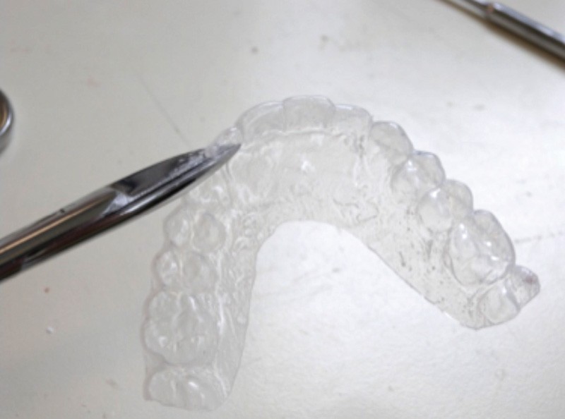 Sa procédure de réalisation ne diffère pas énormément de celle d’une gouttière de contention normale. Donc il est possible de la fabriquer au sein du cabinet, ce qui limite le temps de fabrication par rapport à une plaque de Hawley et le coût. Nous pouvons également réutiliser la gouttière de contention originale du patient, en la modifiant, si le diastème n’est pas trop important.