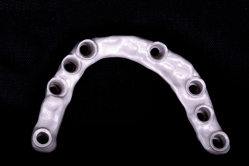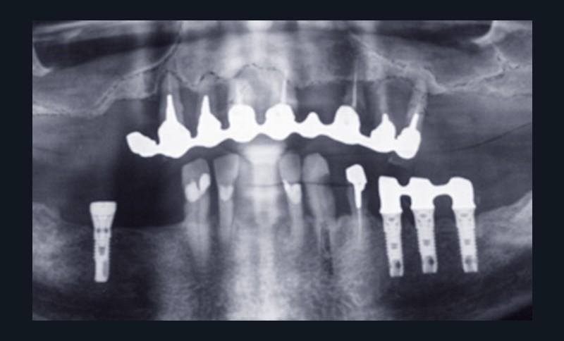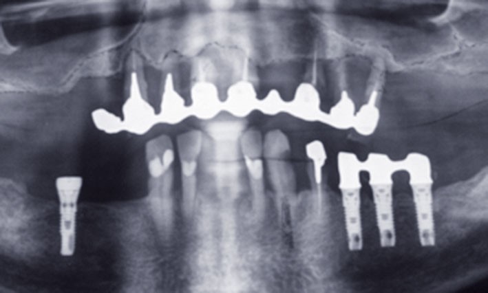 • Maxillaire : suppression des dents résiduelles, mise en place de six implants avec mise en charge immédiate par un bridge provisoire et prothèse d’usage transvissée sur pilotis (type P. Malo).