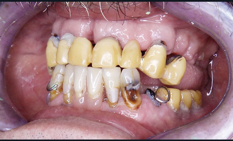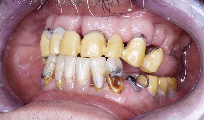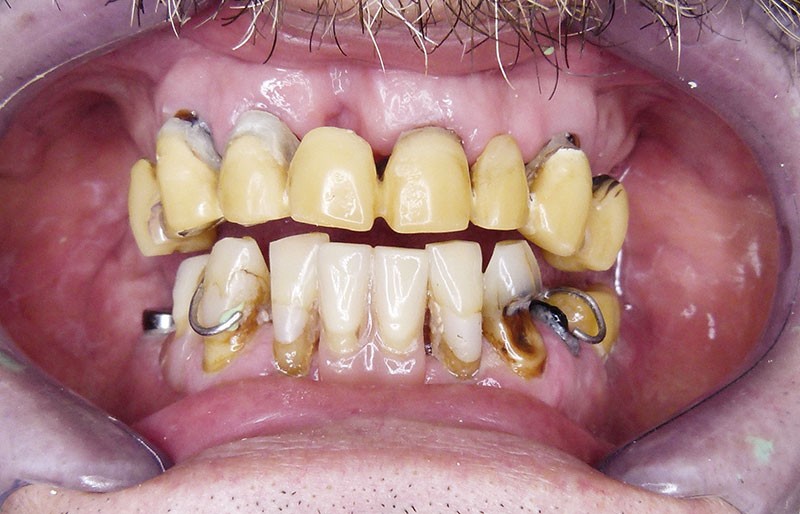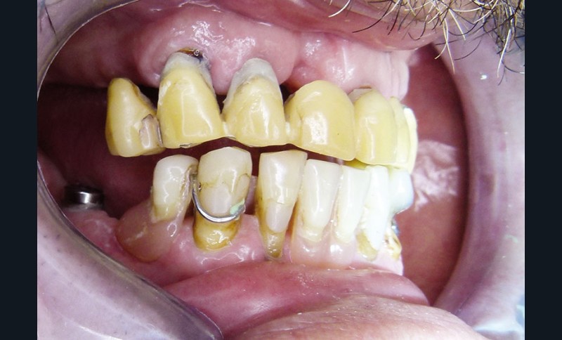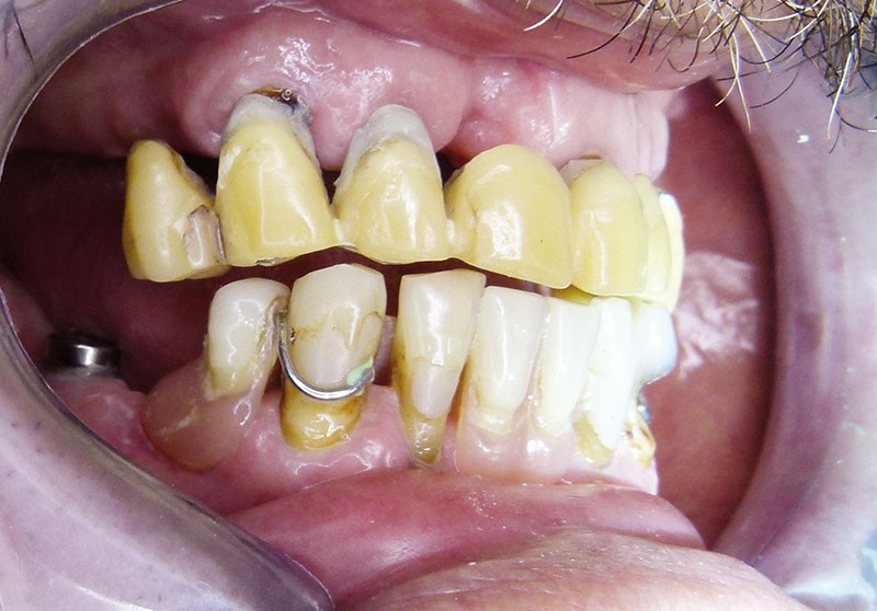Monsieur L… se présente en décembre 2012 pour une demande de réhabilitation complète de sa cavité buccale. Il est âgé de 65 ans. Il présente un bon état de santé générale, sans pathologie restrictive. En revanche, son état bucco-dentaire est pour le moins problématique … Il est porteur de prothèses provisoires qui se sont délitées avec le temps. Plusieurs implants ont été mis en place auparavant, à la mandibule. Les restaurations d’usage n’avaient jamais été réalisées … (fig. 1 et 2).