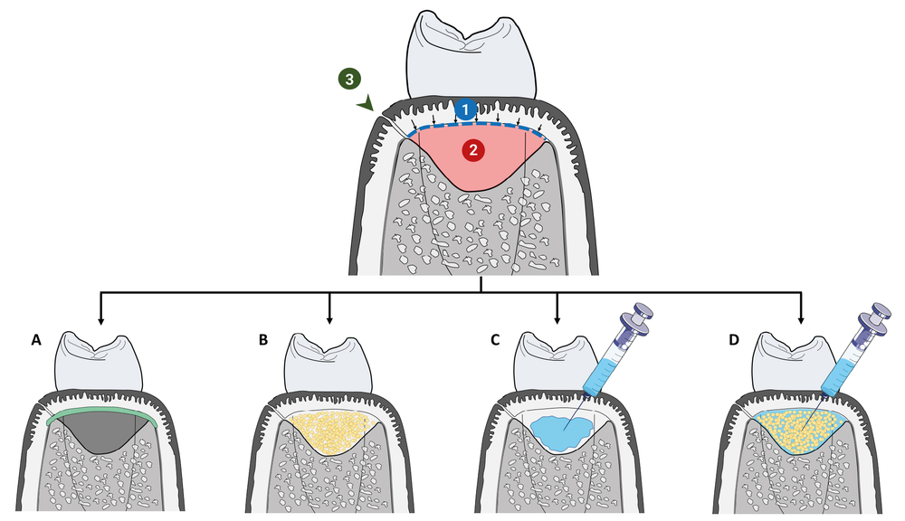 Les défauts infra-osseux possèdent un potentiel de cicatrisation remarquable lorsque les procédures thérapeutiques permettent de débrider efficacement la lésion, d’assurer le maintien d’un espace propice à la formation et la stabilisation du caillot, de limiter les complications infectieuses pendant les phases précoces de la cicatrisation. Les stratégies conventionnelles de reconstruction/régénération parodontale (RP) que sont la régénération tissulaire guidée (RTG), le comblement osseux (CO) et la régénération tissulaire induite (RTI) font appel à l’utilisation de divers biomatériaux pour atteindre ces objectifs [1] (fig. 1). Plusieurs études, dont certaines ont un recul de plus vingt ans, ont établi l’efficacité des procédures de RP ainsi que leur supériorité par rapport à un simple lambeau d’assainissement (OFD). Après une RP, la profondeur de poche parodontale (PPD) résiduelle est plus faible et le gain d’attache est plus important qu’après un OFD. Dans plus de 90 % des cas, la RP aboutit à une fermeture de la poche (PPD ≤ 4 mm) contre 33 % des cas pour l’OFD. La RP améliore également les chances de « survie » dentaire par rapport à l’OFD [2] (tableau 1).