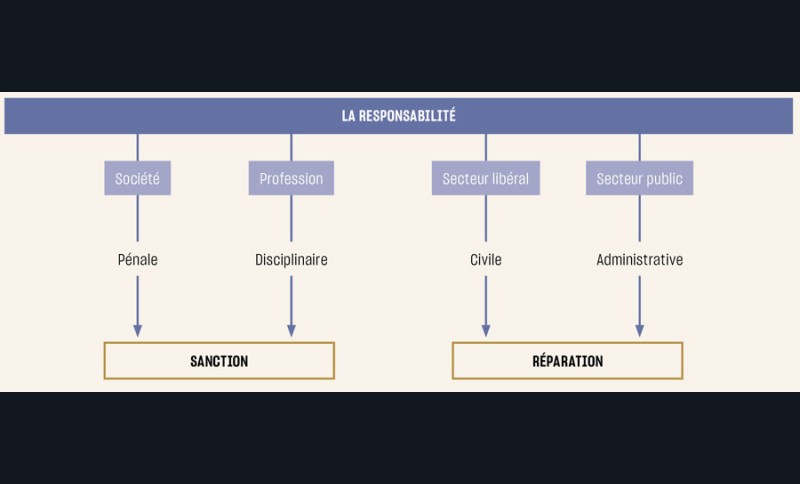 Classiquement, la responsabilité médicale d’un chirurgien-dentiste peut être soit civile ou administrative soit pénale et/ou disciplinaire. La première est dite « responsabilité indemnitaire » et consiste en une indemnisation financière d’un dommage causé par un tiers. La seconde est appelée « responsabilité de sanction » et se traduit par une sanction répressive des comportements que la société réprouve (fig. 1).