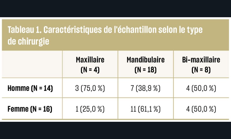 Les réponses de 30 patients (14 hommes et 16 femmes) ont été analysées dans cette étude. L’âge moyen des participants au moment de la chirurgie était de 25 ± 10 ans (21 ± 7 ans pour les hommes et 29 ± 11 ans pour les femmes). 22 patients ont bénéficié d’une chirurgie unimaxillaire et 8 d’une chirurgie bimaxillaire (tableau 1).