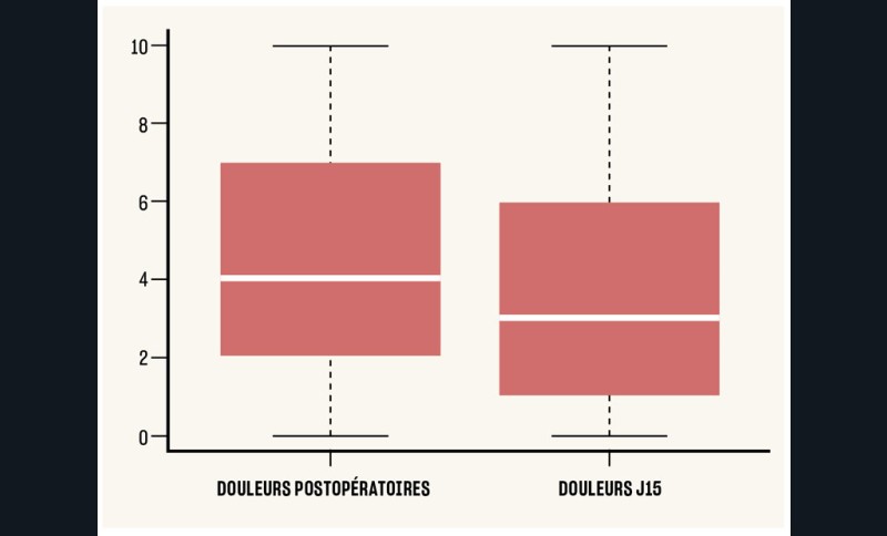 On note une diminution de la douleur entre la période postopératoire (au moment de l’hospitalisation) et à 15 jours avec une douleur postopératoire évaluée en moyenne à 4,5 sur 10 (± 3,0) et une douleur à 15 jours de l’opération évaluée en moyenne à 3,6 sur 10 (± 2,8) (p = 0,01).