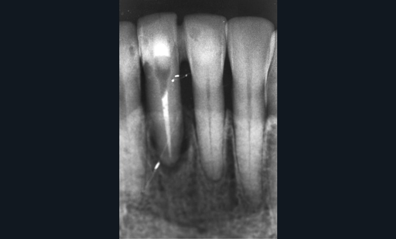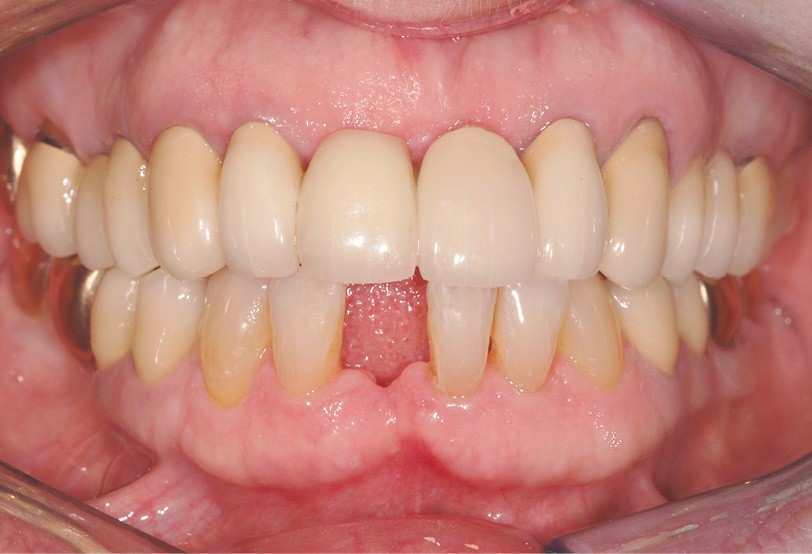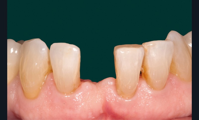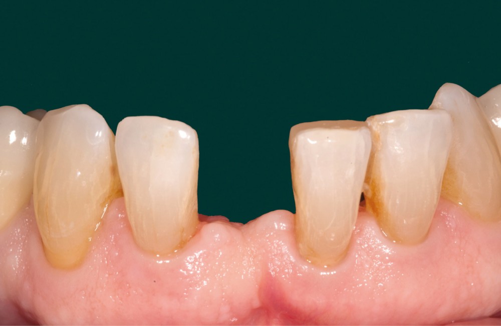 Le cas clinique présenté dans cet article traite de la gestion d’un édentement mandibulaire dans le secteur antérieur, survenu après un accident de la voie publique ayant entraîné une aggravation d’une lésion parodontale existante (fig. 1). Cette pathologie a nécessité l’extraction de la dent qui avait été traitée huit ans auparavant par une attelle-bridge en zircone, compte tenu de l’impossibilité médicale de mettre en place un implant (fig. 2).