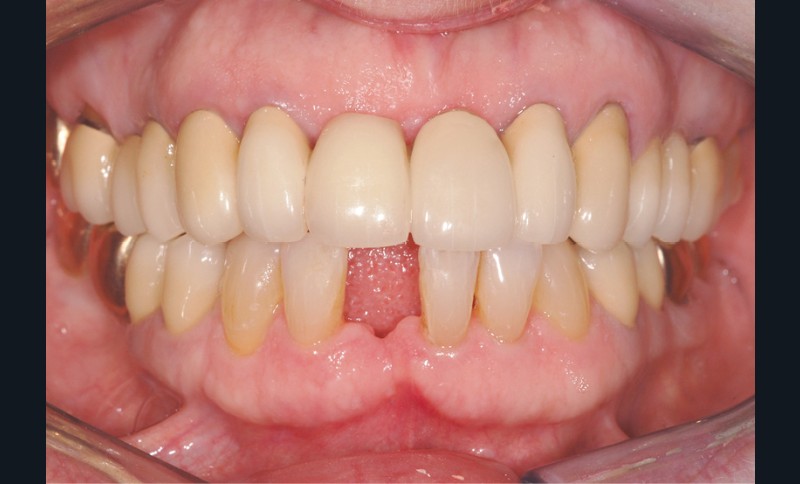 À l‘époque de la réalisation de l’attelle, le choix du matériau se faisait entre le métal et la zircone. Les inconvénients majeurs de ces deux matériaux résident dans la complexité du protocole de collage [3] d’une part, et dans le manque de fiabilité à long terme de ce dernier, d’autre part (fig. 4).