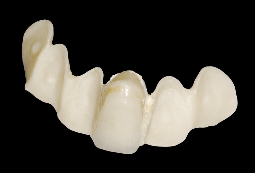La patiente est venue consulter à la suite du descellement de la pièce zircone qui, agissant comme une attelle de contention, subissait des contraintes de torsion importantes. Malgré plusieurs tentatives infructueuses de remise en place (fig. 3), nous avons proposé à la patiente, compte tenu des rapports occlusaux favorables, de réaliser un bridge cantilever en disilicate de lithium (IPS e.max, Ivoclar Vivadent) plus apte au collage [1]. Cette thérapeutique est un choix biologique et biomécanique séduisant, validé par la littérature scientifiquement [2].