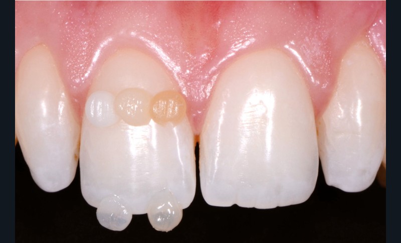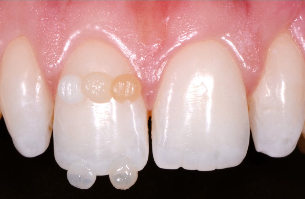 Après réalisation de modèles d’étude, de cires de diagnostic (wax-up) sur 12 et 22, puis validation de la forme en bouche par la technique des masques (mock-up) (fig. 3), le choix de la couleur se fait avant l’isolation pour éviter un biais de sélection occasionné par la déshydratation des dents (fig. 4).
