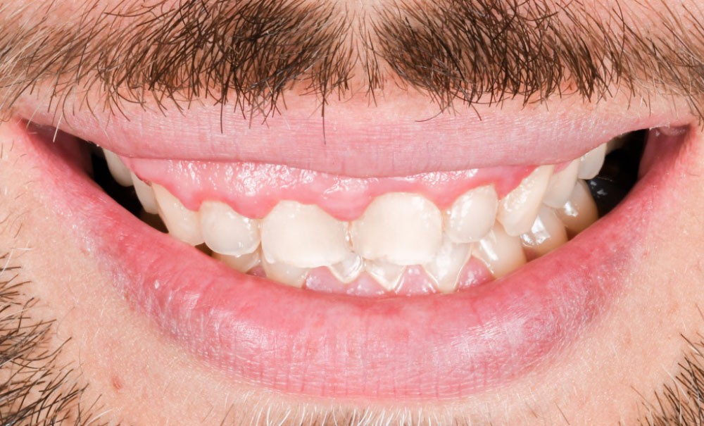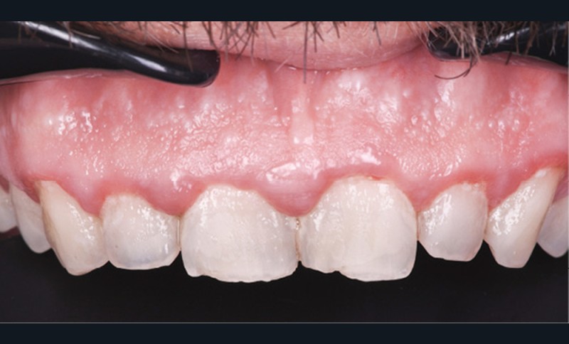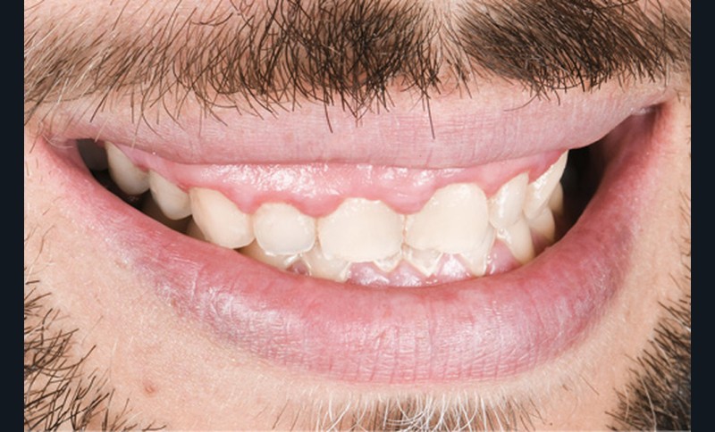 Nous recevons un patient âgé de 36 ans pour une première consultation. Sur le plan général, il ne présente aucune pathologie. Sa demande esthétique concerne l’aspect gingival et asymétrique de son sourire. Cela semble être causé par une éruption passive altérée [3]. Il a déjà pris plusieurs avis, mais il reste un peu perdu sur la stratégie à adopter. Certains praticiens lui ont proposé des traitements orthodontiques ou la réalisation de restaurations indirectes sans travail préalable sur l’aspect gingival.