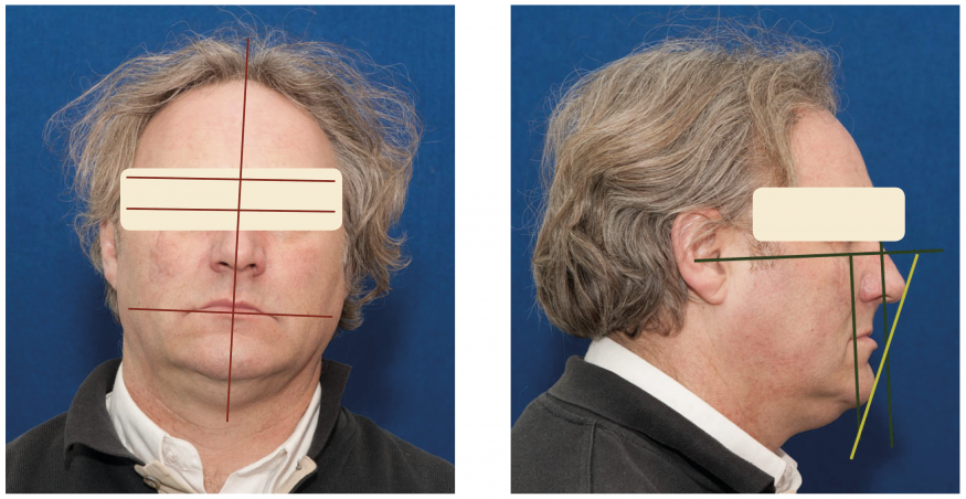 L’examen clinique, aidé des photographies du visage de face et de profil, permet d’établir un défaut de croissance (asymétrie faciale) de l’hémiface droite sur le plan transversal (séquelle du traumatisme) ainsi qu’une éversion des commissures labiales. Sur le plan sagittal, le profil du patient est ortho-frontal avec une rétrocheilie supérieure due à la rétromaxillie apparente. Sur le plan vertical, une légère diminution de la hauteur de l’étage intermédiaire est visible.