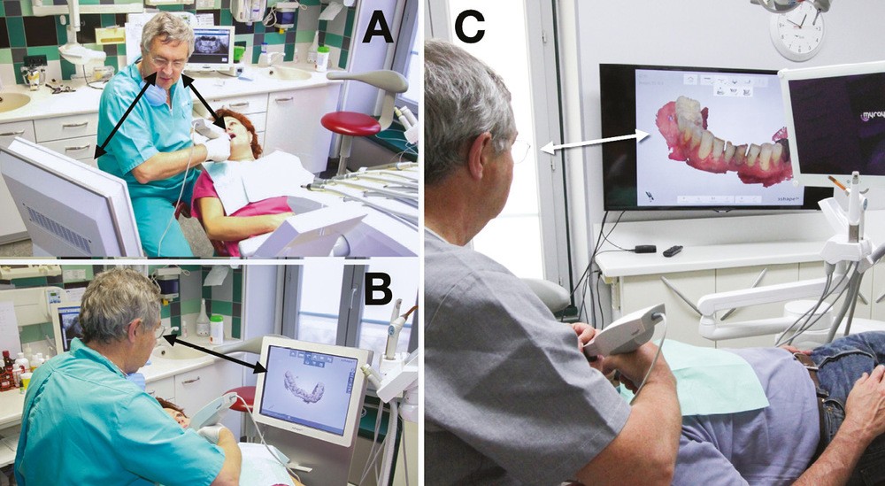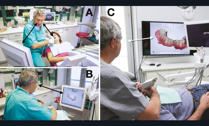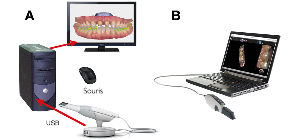 Dans le premier cas, le dispositif représente un certain encombrement, mais il peut être déplacé d’un cabinet à un autre pour éventuellement être utilisé par plusieurs praticiens. Actuellement, ce type de système possède une batterie intégrée évitant d’éteindre et de rallumer l’appareil lors de son déplacement.