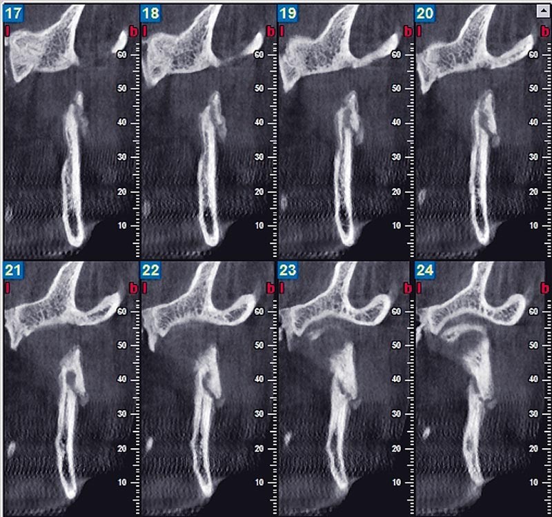 Enfin, le cone beam est un moyen précis d’évaluation du volume osseux [3] pour établir, à titre indicatif, les modifications morphologiques du condyle résultant de diverses pathologies. Les données volumétriques obtenues sont utiles pour comparer les côtés gauche et droit de la mandibule et être en mesure d’évaluer l’asymétrie entre les deux condyles dans les divers types de malocclusion. Plus généralement, il rend possible la réalisation de coupes épaisses comme une reconstruction panoramique volumique ; la sélection des densités les plus élevées permet d’isoler les structures osseuses et dentaires [4].