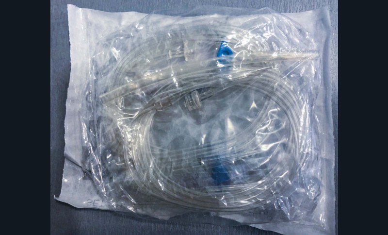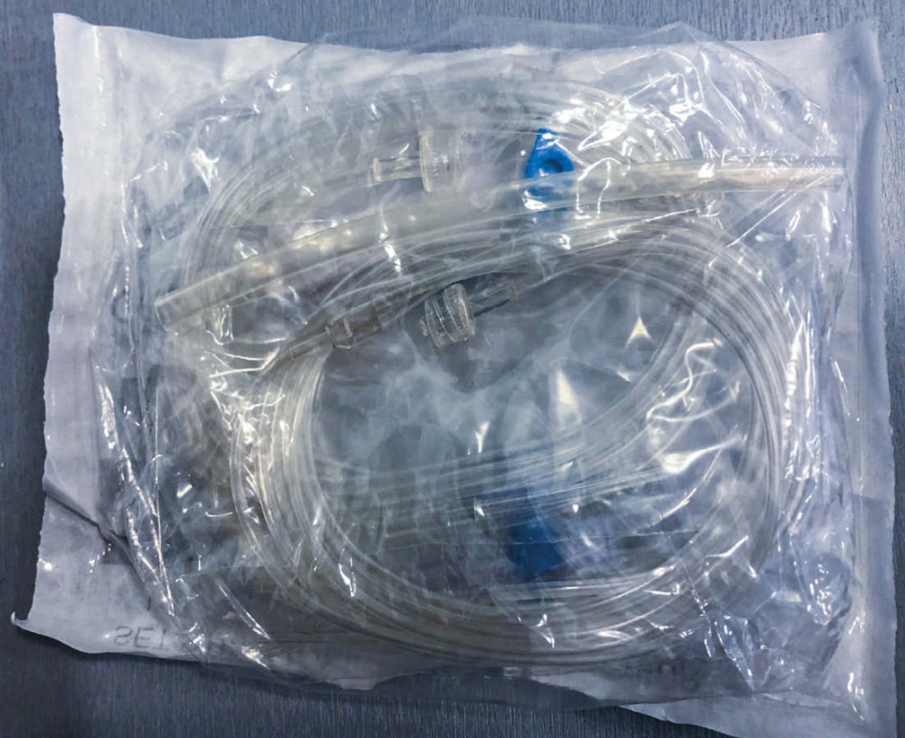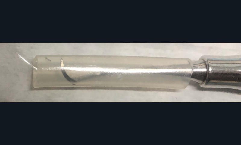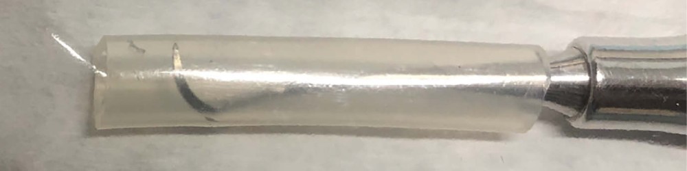 Afin de faciliter la protection, je vous propose de récupérer le tube silicone résistant et transparent (fig. 1) inclus dans le sachet du set stérile de l’irrigation d’un moteur de chirurgie (fig. 2). Il est initialement prévu pour le remplacement du silicone de la gaine d’irrigation. Il suffit de le découper en fonction de la dimension nécessaire pour protéger la partie active des instruments piquants, comme sur l’exemple avec le CK6 (fig. 3). Ensuite, l’enveloppement de l’instrument est plus facile et évite la perforation du sachet, conservant l’état stérile dans le temps (fig. 4).