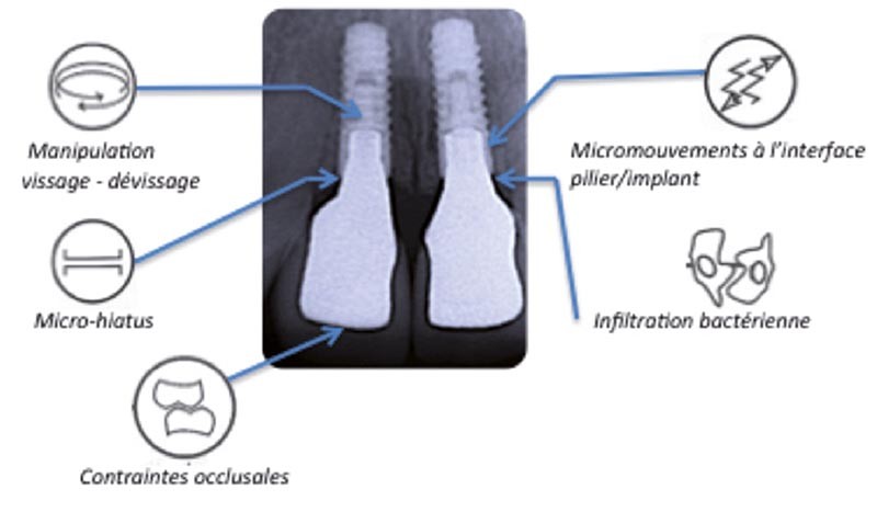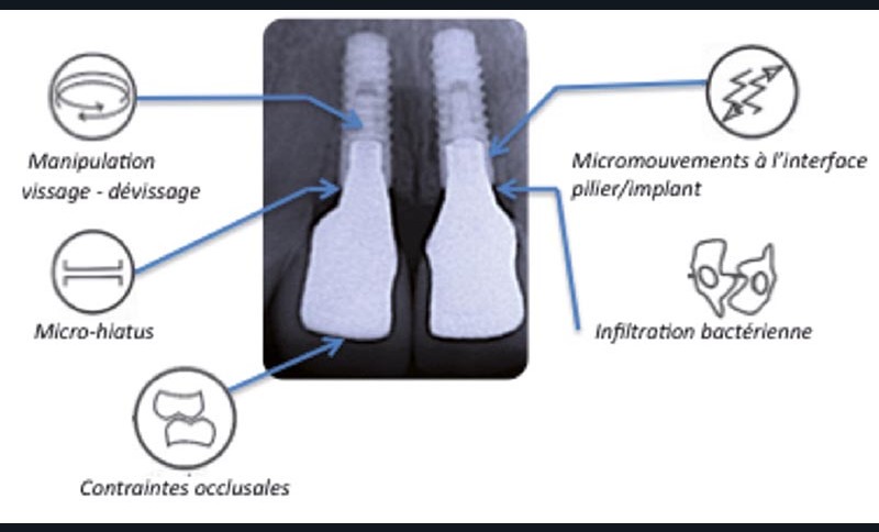 La qualité de l’ostéointégration d’un implant et sa pérennité, dépendent de la santé des tissus péri-implantaires et des forces occlusales qui lui sont appliquées. Les tissus gingivaux péri-implantaires, peuvent être lésés par des perturbations qui s’exercent au niveau de la jonction prothèse-implant, soit de façon chronique (micromouvements en fonctionnement) (1, 2), soit de façon transitoire, liées aux manipulations répétées de pose et dépose d’éléments prothétiques (3) (fig. 1).