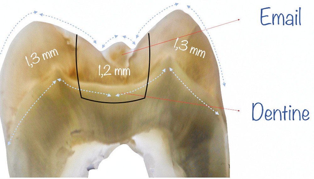 À l’observation d’une molaire naturelle, il est possible de constater que l’émail et la dentine ont une disposition reproductible à l’intérieur de la dent (fig. 1) [3, 4]. La dentine est concave au niveau de la face occlusale et sa couleur est souvent très saturée. L’émail qui recouvre cette dentine sur la face occlusale est convexe et diminue avec l’âge.