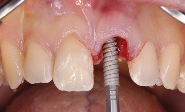 En fonction de la situation initiale, la morphologie de la dent naturelle pourra servir pour le moulage de la dent transitoire. L’objectif est ici de fixer une coque en résine à un composant transitoire en titane, lui-même vissé sur l’implant. Ce composant comprend un col usiné et poli qu’il ne faudra pas recouvrir de résine afin de ne pas perturber la cicatrisation de la zone péri-osseuse. Cette pièce existe en différentes hauteurs et largeurs de col (Anthogyr) qu’il conviendra de choisir en fonction de la dent et du biotype gingival.