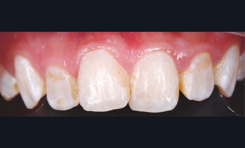 Le cas présenté ici concerne une patiente de 28 ans se présentant en consultation avec un motif principal : améliorer l’esthétique de son sourire. En effet, elle indique être complexée par la couleur de ses dents et les taches qui ne disparaissent pas malgré un brossage efficace (fig. 1).
