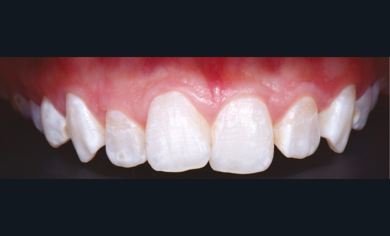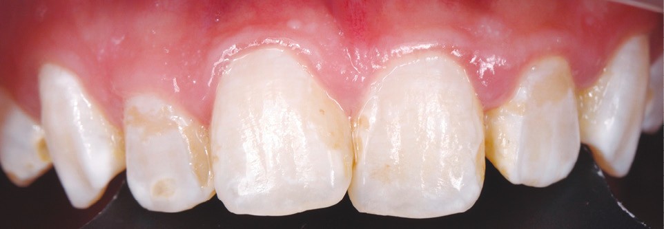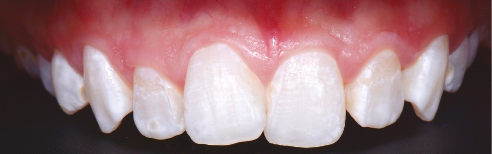Elle présente une fluorose généralisée modérée. Les hypominéralisations sont localisées au sein des zones superficielles de l’émail.