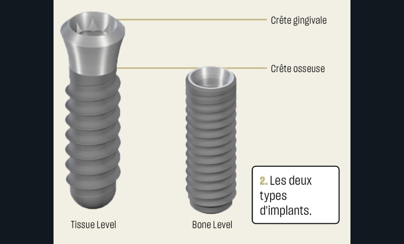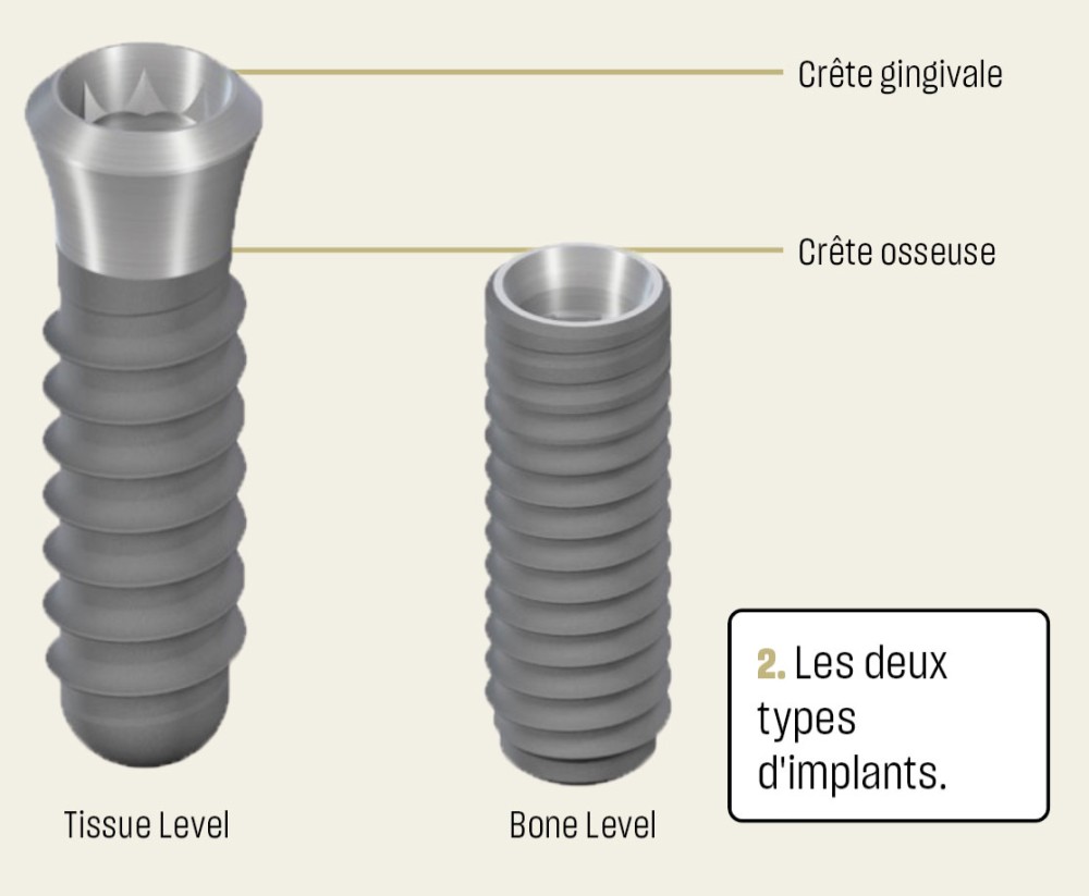 - Les implants Tissue Level (TL) dont le col est lisse, transgingival et supra-osseux. La connexion avec les éléments prothétiques se fait à distance de la crête osseuse.