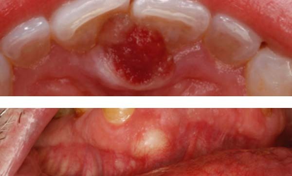 Examen clinique. On observait une tumeur gingivale sessile, hémisphérique, de 8 mm de diamètre, siégeant sur la gencive palatine, au contact de 11 et 21. Elle donnait l’impression de refouler la muqueuse saine et sa surface rouge était occupée par une ulcération.
