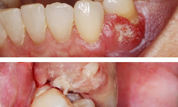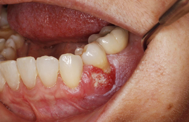Histoire de la maladie. En raison de l’absence de douleurs, la patiente a attendu 2 mois avant de se rendre chez son chirurgien-dentiste. Elle s’est finalement décidée, car la lésion avait augmenté de taille et avait tendance à saigner.
