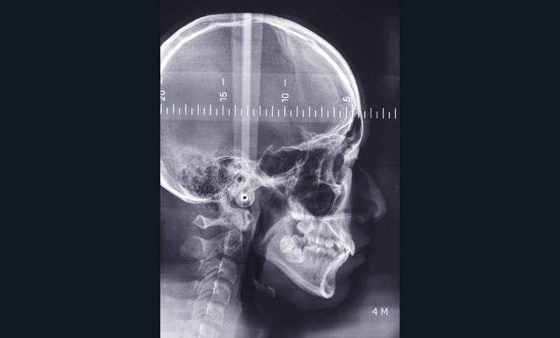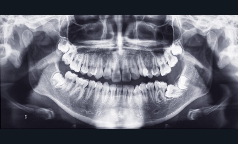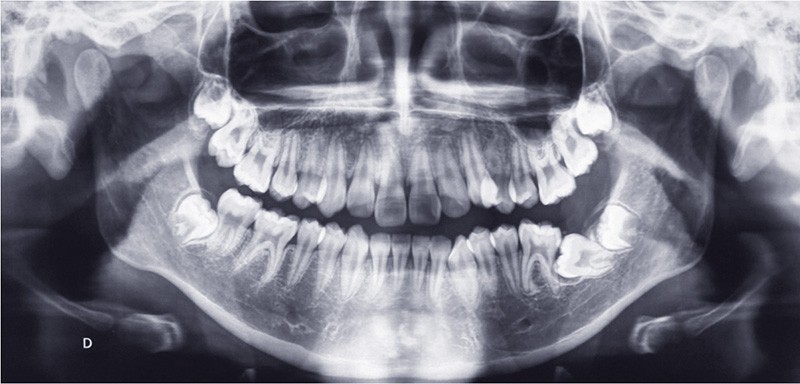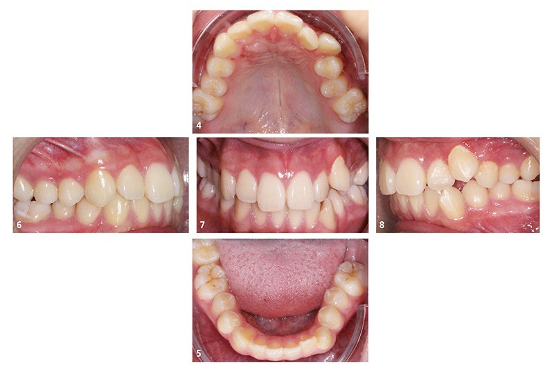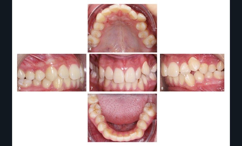 Sur le plan dentaire, au maxillaire, le patient présente une arcade en lyre avec de nombreuses malpositions (fig. 4). À la mandibule, la 37 est absente de l’arcade (fig. 5). Le patient présente une classe I d’Angle droite et gauche (fig. 6 et 7). Le surplomb et le recouvrement sont satisfaisants, les milieux sont alignés, et il existe une occlusion inversée 22/33 (fig. 8).