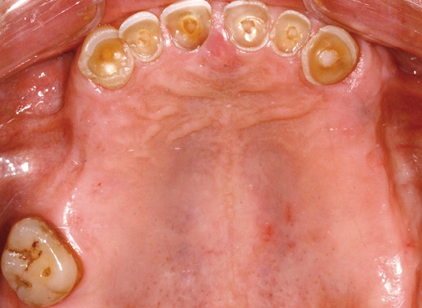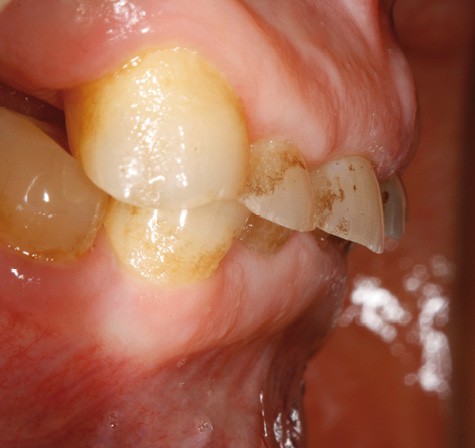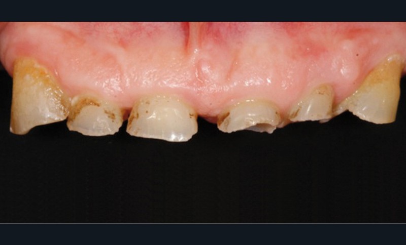 • L’examen intrabuccal montre de nombreux édentements non compensés (14, 15, 16, 24, 25, 26, 27, 47 et 36) ainsi que des pertes de substance très importantes, notamment dans le secteur antérieur.