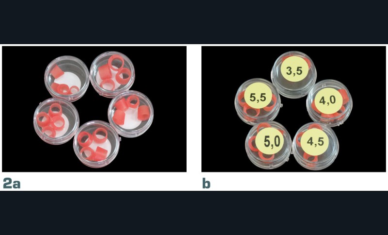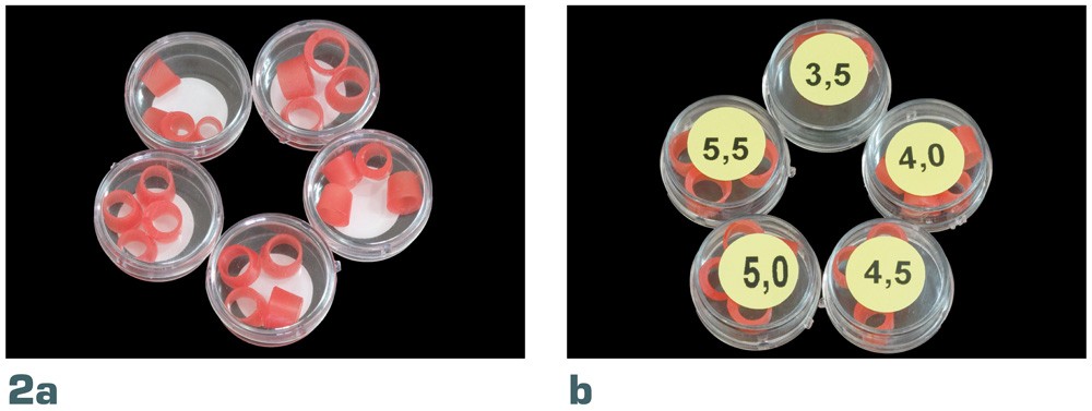 • Des cônes de compensation pour implants, fabriqués en cire modelable, existant en cinq diamètres (fig. 2a, b).