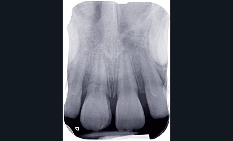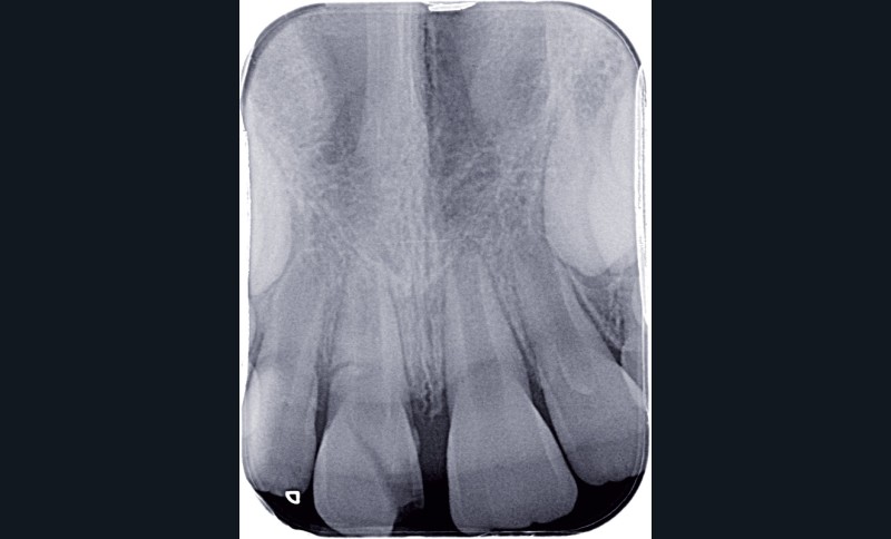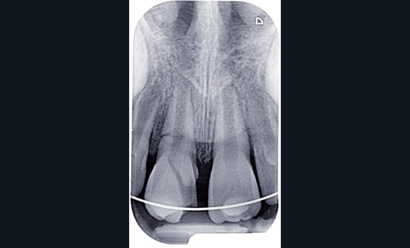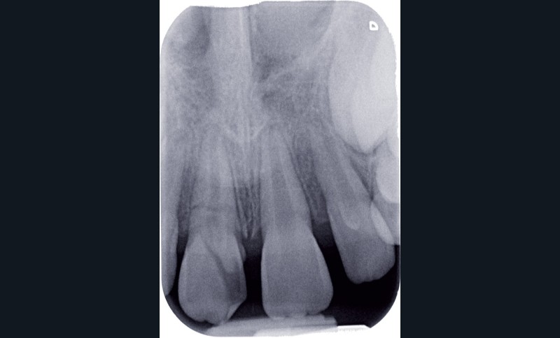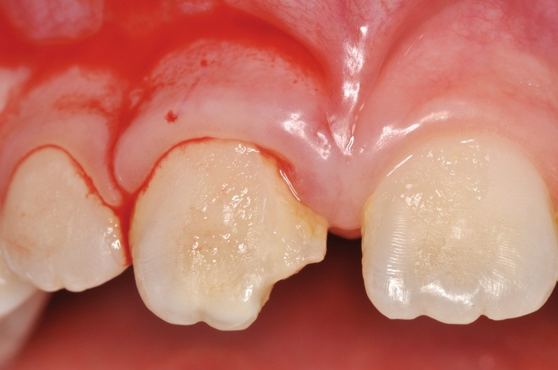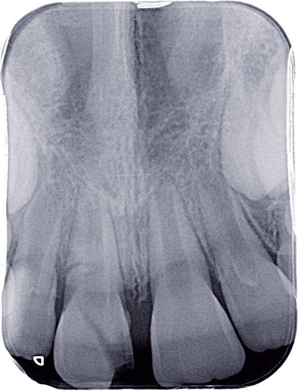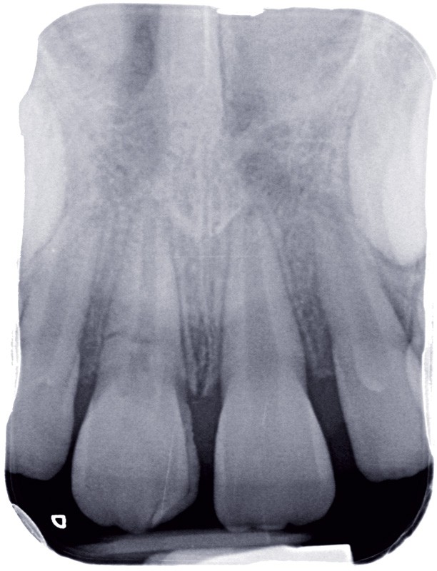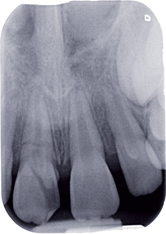 a à d Jeune patiente âgée de 8 ans, adressée suite à un traumatisme survenu 3 semaines auparavant, pour l’extraction de sa 21. La vue clinique montre un saignement ligamentaire, une mobilité coronaire et une fracture coronaire amélodentinaire longitudinale partant de l’angle mésial et se poursuivant en direction radiculaire sous-gingivale (a). Un test de vitalité positif indique que la dent est vitale, la radiographie permet de poser le diagnostic de fracture coronoradiculaire, et d’objectiver l’immaturité radiculaire (stade 8 de Nolla) (b). Une contention est mise en place et la plaie dentinaire coronaire est scellée au mieux par collage afin de limiter le risque d’une complication infectieuse (c). A 15 jours la dent est vivante et aucune complication n’est apparue (d). La patiente est revue après 3 mois pour déposer la contention, le test de vitalité est positif, et la radiographie de contrôle montre une apexogenèse en cours (e). Cependant la gencive s’est invaginée dans le trait de fracture (f). La zone est débridée sous microscope (g) puis scellée et reconstituée à l’aide d’un adhésif SAM et d’un composite fluide (h). Le contrôle radiographique à 6 mois est satisfaisant (i). Ce cas clinique illustre le fort potentiel des pulpes jeunes et du ligament alvéolodentaire à résister aux agressions et à assurer les fonctions dentinogénétiques et l’édification radiculaire.