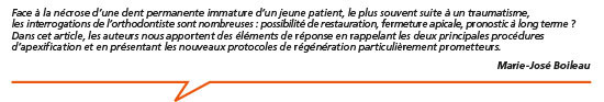 L’apport sanguin étant supprimé, il s’ensuit une asphyxie et une nécrose tissulaire conduisant à la nécrose pulpaire. Le praticien est confronté à deux problèmes anatomiques majeurs pour le maintien à long terme de la dent sur l’arcade : réaliser un traitement endodontique sur une dent à apex largement ouvert et aux parois canalaires généralement fines et dont l’édification est incomplète. Ces deux éléments vont respectivement rendre difficile l’obtention d’une étanchéité apicale et induire à une fragilisation mécanique de la dent pouvant conduire à des fractures radiculaires (2).