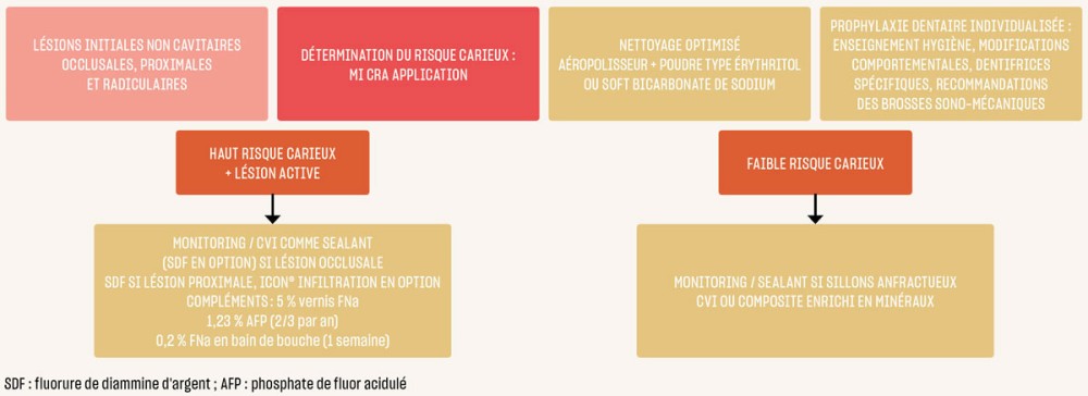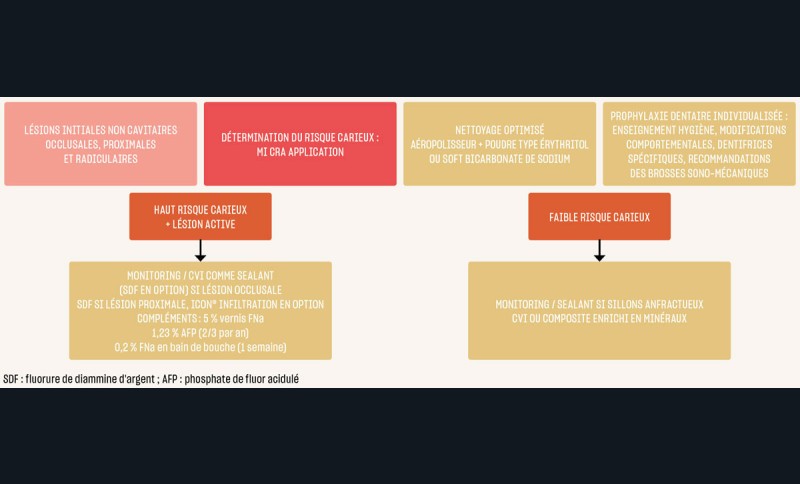 Cliniquement, il s’agit d’évaluer le risque carieux pour cibler les patients à risque, utiliser les outils de diagnostic avec signaux photoniques permettant un diagnostic précoce, individualiser les traitements préventifs, utiliser la gamme de produits reminéralisants.