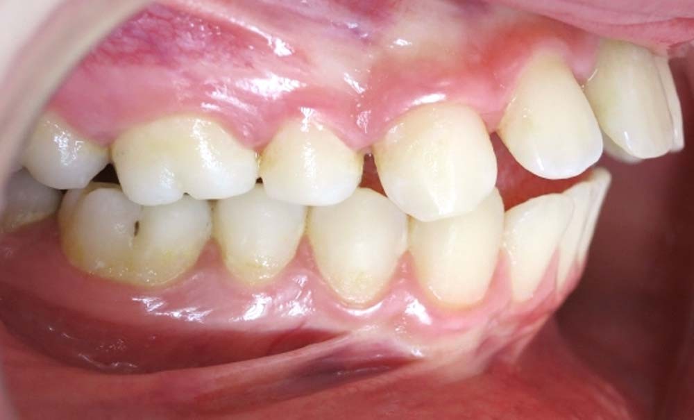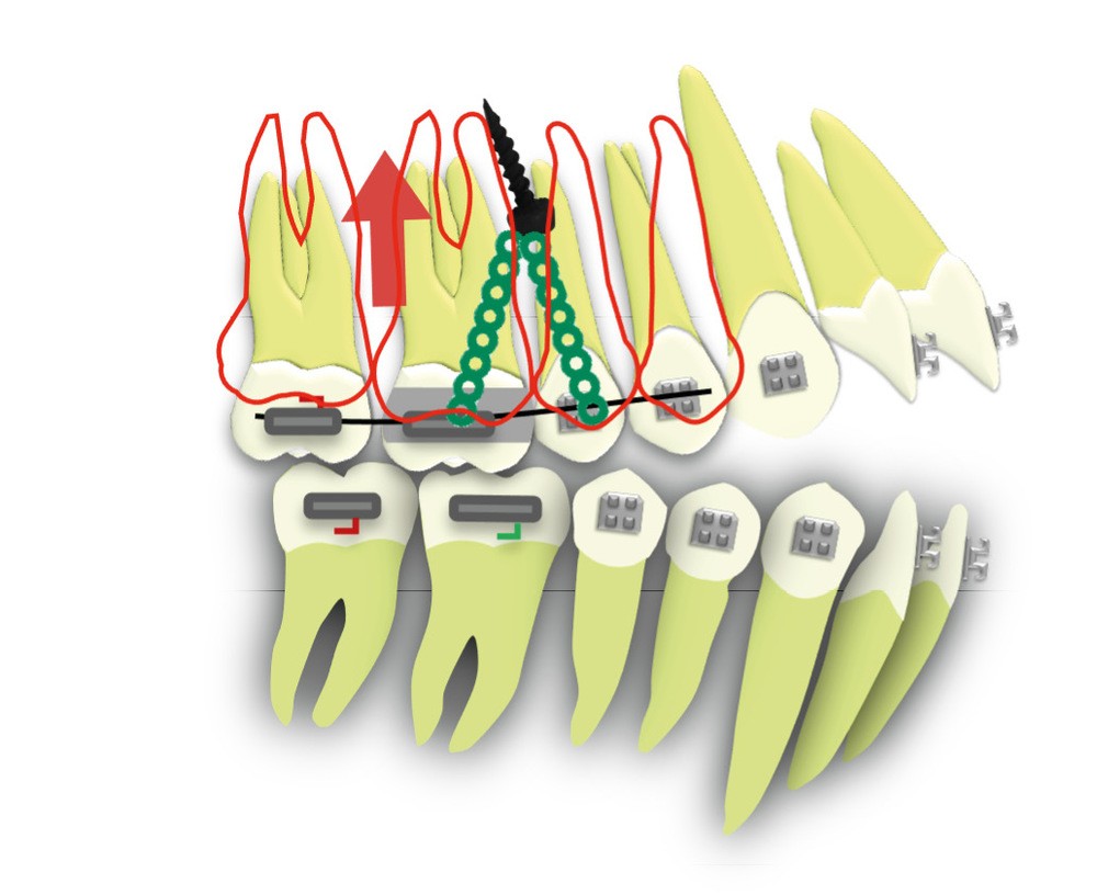Les infraclusies antérieures chez l’hyperdivergent constituent un challenge pour l’orthodontiste (fig. 1 a-c) [1]. Les approches thérapeutiques conventionnelles s’avèrent actuellement peu efficaces chez l’adulte [2-4] et se traduisent par un taux élevé de récidive, allant de 25 % à 60 % [5, 6]. Aujourd’hui, en alternative à la chirurgie orthognathique reconnue comme le « gold-standard » [7], l’ingression molaire à l’aide d’ancrages osseux type minivis ou miniplaques a connu un essor, et est de plus en plus préconisée. Elle permet une projection en haut et en avant du menton par autorotation mandibulaire antihoraire et la fermeture de l’infraclusie antérieure [7-13] (fig. 2), ce qui peut garantir plus d’efficacité et une meilleure gestion des effets secondaires [14].