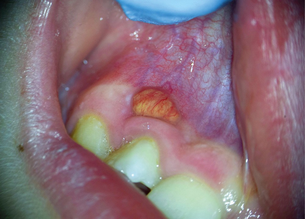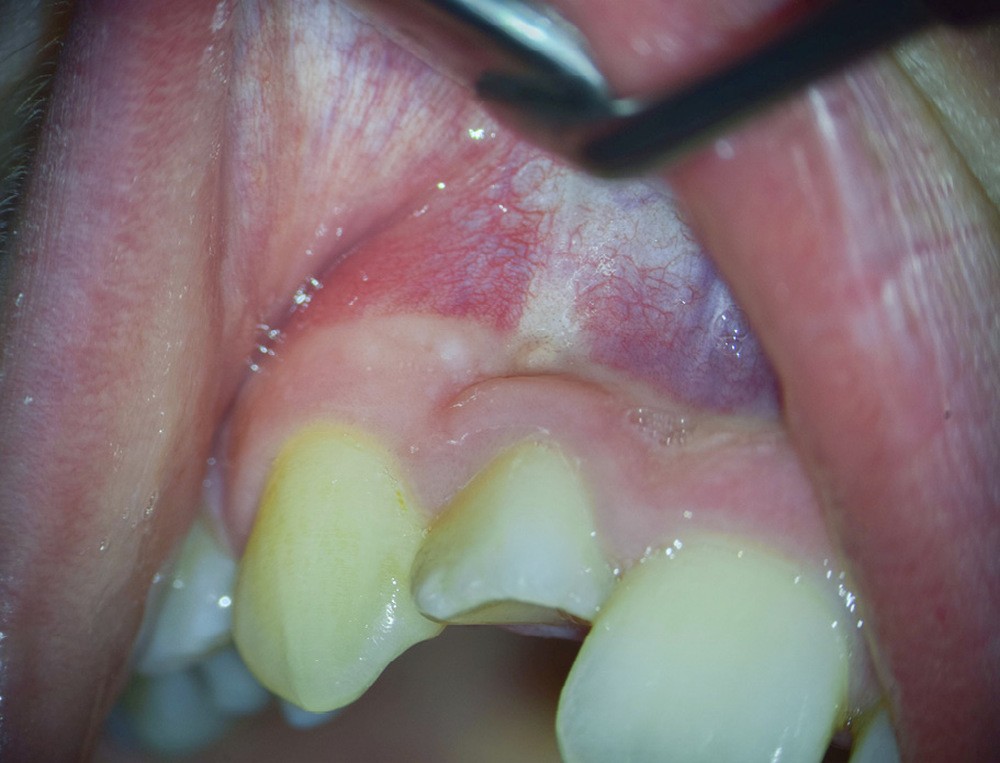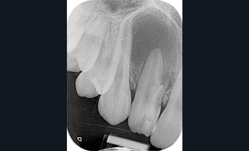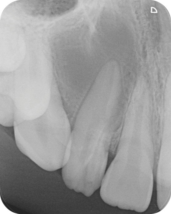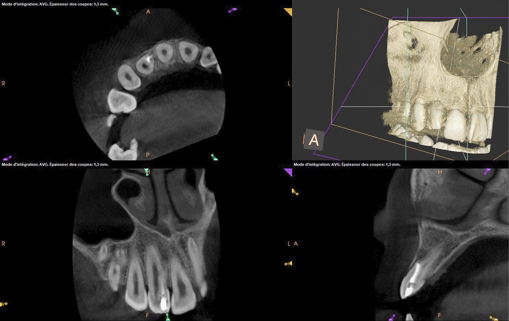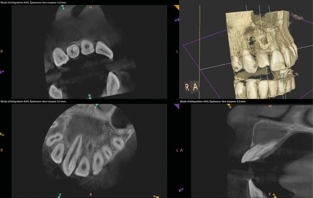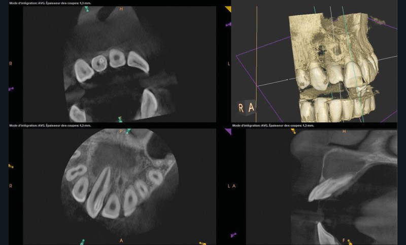 La patiente, âgée de 12 ans, s’est présentée à ma consultation avec une demande du chirurgien de réaliser le traitement endodontique de la 12 avant le curetage sous anesthésie générale. La radiographie périapicale préopératoire a mis en évidence une anatomie complexe. Les tests préopératoires ont montré un sondage parodontal sain, une percussion positive et un test au froid positif. La patiente présentait également une fistule vestibulaire active. Le Cone Beam a mis en évidence la présence d’une dens in dente et d’une lésion imposante ainsi qu’une palatoversion importante de la racine de la 12. La lésion est-elle responsable de ce mouvement dentaire ? (fig. 1, 2 et 3).
