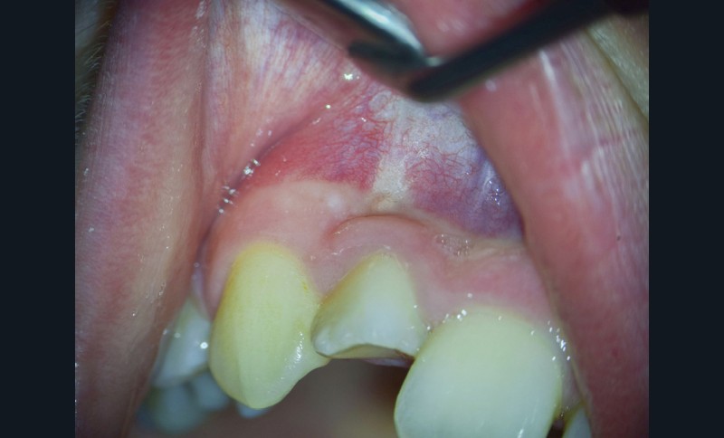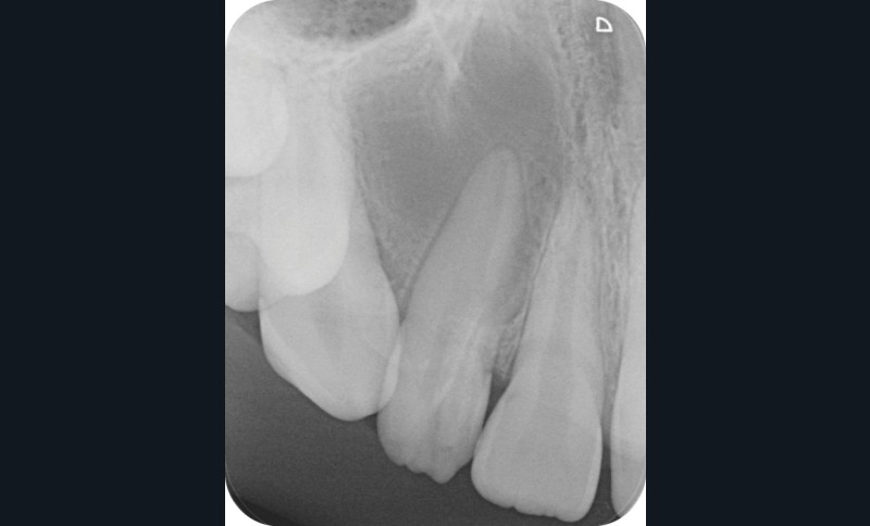 Le contrôle clinique à un mois m’a permis d’apprécier une cicatrisation complète de la fistule, augurant une future cicatrisation osseuse (fig. 7). Cette cicatrisation a pu être objectivée radiographiquement lors du contrôle à 6 mois (fig. 8), du contrôle à 1 an (fig. 9) et sur le Cone Beam à 1 an (fig. 10).