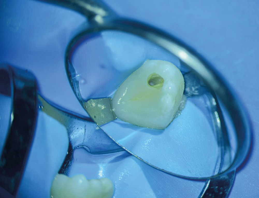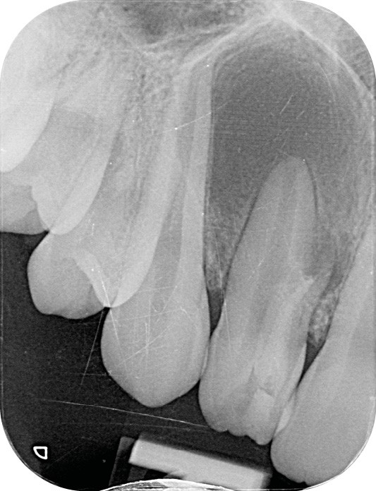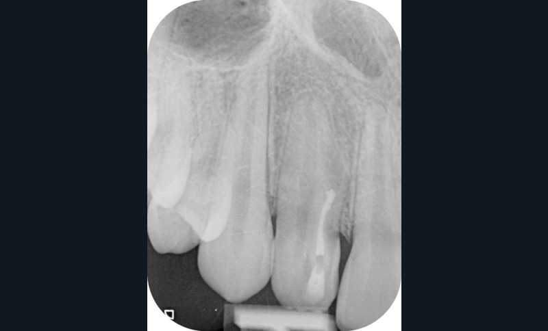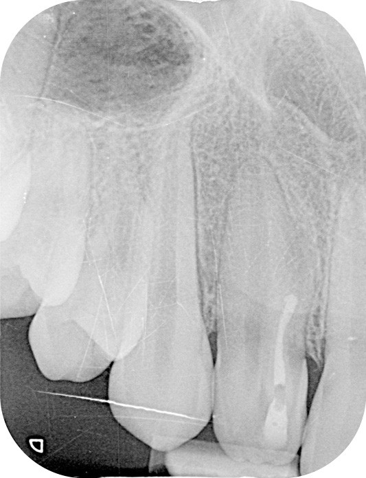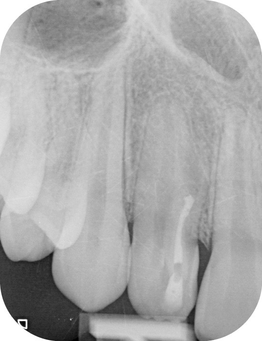 Le test au froid et la position de la lésion m’ont permis de prendre ma décision thérapeutique. En effet, la lésion située uniquement sur la face vestibulaire de la dent en regard de l’apex du canal de la dens in dente et la persistance d’un test au froid positif à travers chacune des séances de soins m’ont permis de m’assurer que la dent principale était bel et bien vivante.