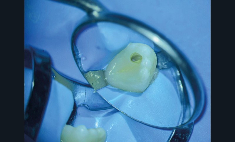 Lors de la séance d’obturation, le canal étant sec malgré la persistance de la fistule, j’ai réalisé l’obturation radiculaire et coronaire. L’obturation radiculaire a été réalisée à l’aide d’un ciment biocéramique en technique du single cône coupé et foulé à l’entrée canalaire (fig. 6).
