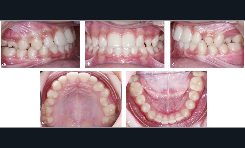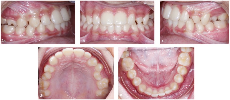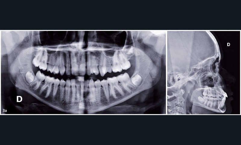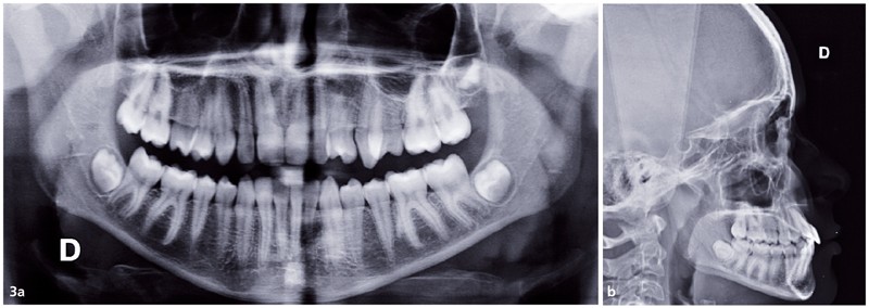 Sur le plan occlusal et dentaire, on observe une classe III molaire et canine à gauche, une proalvéolie maxillaire, une occlusion inversée au niveau des 15/46 et 25/35-36, une non concordance des milieux incisifs et une transposition complète de 23 et 24 (fig. 2 et 3).