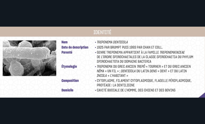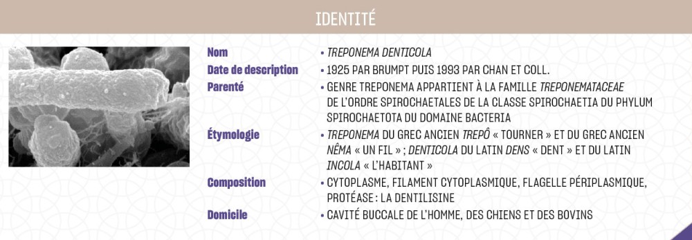 Le genre Treponema est connu pour provoquer des infections, telles que la syphilis (Treponema pallidum). Cependant, les tréponèmes existent également dans le microbiote intestinal, oral et génital. De nombreuses espèces de Treponema peuvent être détectées dans la cavité buccale. Cette section se concentre sur Treponema denticola (T. denticola), fortement associé à Porphyromonas gingivalis (P. gingivalis) dans la parodontite.