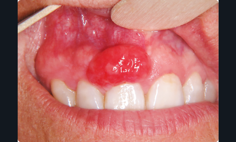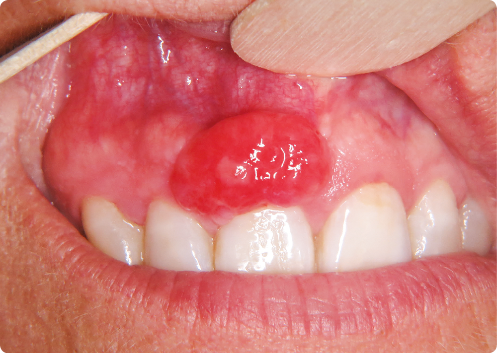 • À l’inspection, on observait un nodule érythémateux d’environ 1 cm de diamètre, de surface lisse, d’aspect pédiculé, développé aux dépens de la papille gingivale située entre 11 et 12. La palpation du nodule de consistance ferme provoquait un saignement.