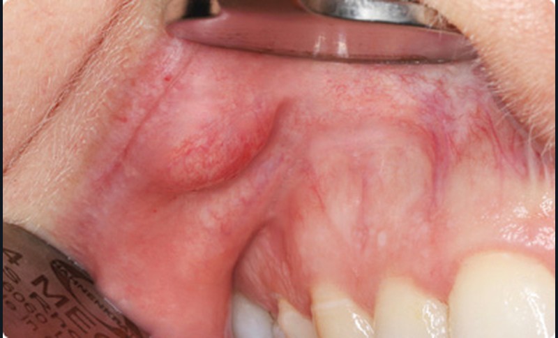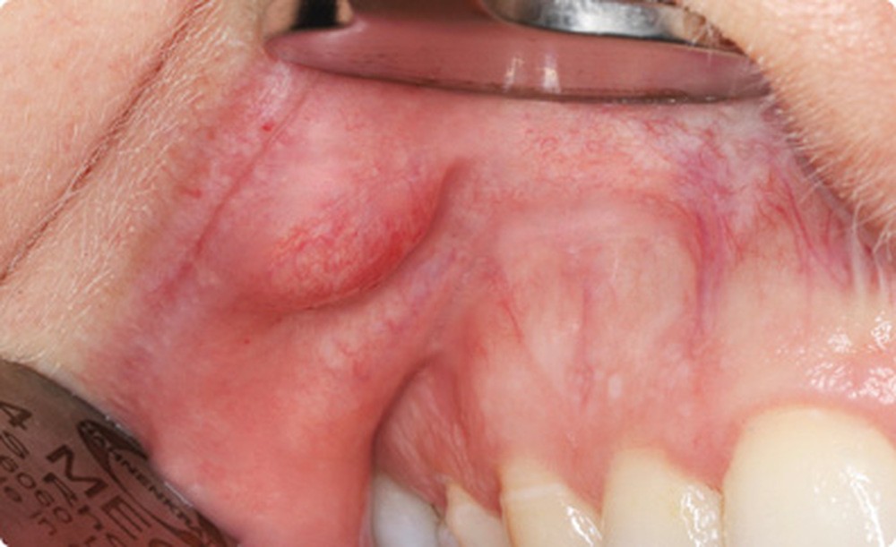 - Cette patiente avait une très bonne hygiène bucco- dentaire et présentait deux arcades dentaires indemnes de caries et de soins. Dans la lèvre supérieure droite, on palpait un nodule sous-muqueux, indolore, ferme, bien limité, mobile, arrondi, de 4 mm de diamètre. Lorsque la muqueuse était mise en tension, il prenait une couleur jaunâtre.