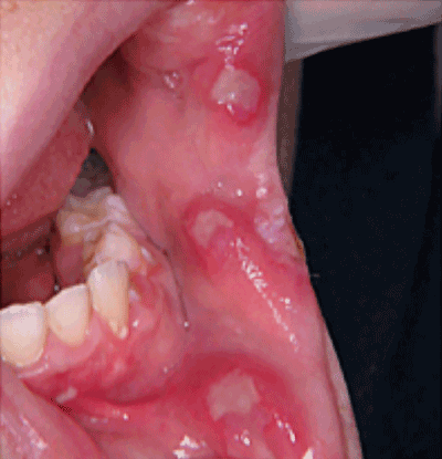 Examen clinique. Il révélait plusieurs ulcérations infra-centimétriques, cernées par un liseré érythémateux. Les lésions étaient localisées sur la muqueuse non kératinisée jugale et labiale. La palpation des aires ganglionnaires cervicales mettait en évidence des adénopathies multiples douloureuses.