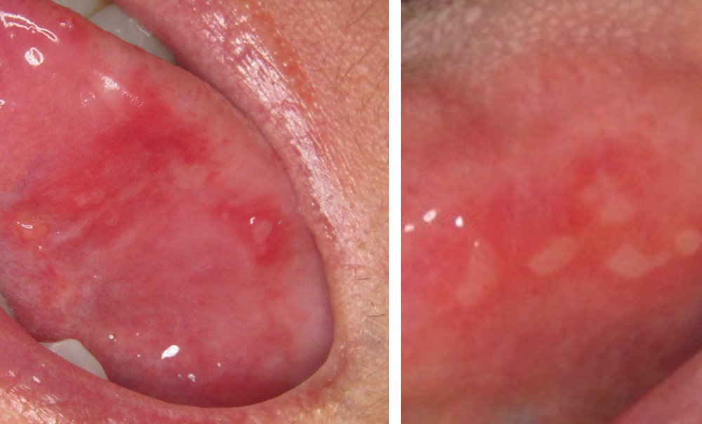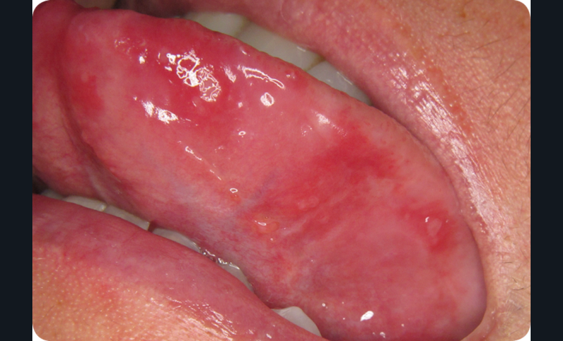 • Patiente de 39 ans qui présentait des « aphtes » de la langue en permanence depuis un an. Elle a eu un traitement par acyclovir pendant 15 jours, prescrit par son médecin généraliste, et par colchicine pendant 3 mois, prescrit par son dermatologue, qui se sont révélés inefficaces.